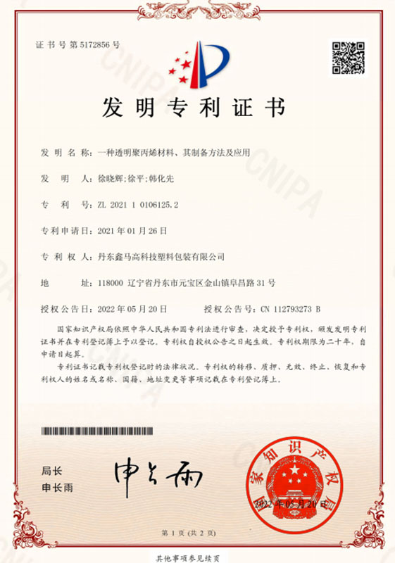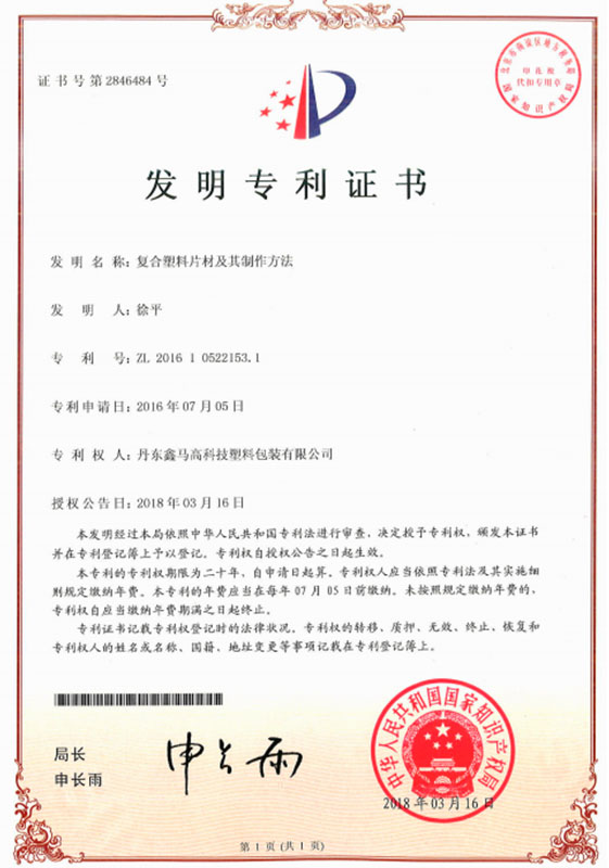 С момента своего основания компания постоянно внедряет инновации и разрабатывает новые продукты. В 2010 году компания разработала «Высокобарьерную гибкую пластиковую упаковочную пленку», которая получила национальные сертификаты «Патент на полезную модель» и «Патент на изобретение», а также сертификат «Специализированный, передовой и инновационный продукт» от Департамента малых и средних предприятий провинции Ляонин. Используя эту запатентованную технологию, компания разработала «Многослойный соэкструдированный пластиковый стаканчик», который также получил сертификат «Специализированный, передовой и инновационный» от Департамента малых и средних предприятий провинции Ляонин в 2012 году. «Модифицированный пластиковый лист POEPP» также получил сертификат «Специализированный, передовой и инновационный» от Департамента малых и средних предприятий провинции Ляонин в 2014 году. В 2016 году «Антиоксидантный упрочненный полипропиленовый пластиковый лист» получил сертификат «Специализированный, передовой и инновационный» от Бюро обслуживания предприятий провинции Ляонин. Компания также подала заявку на регистрацию товарного знака «Синьма». В 2013 году компания получила «Национальную лицензию на производство промышленной продукции» и сертификат системы менеджмента качества ISO9001:2015. В 2016 году мы разработали «Композитный пластиковый лист и способ его изготовления», на который в 2018 году был получен национальный патент на изобретение. Этот запатентованный продукт позволяет эффективно повысить качество пластиковой упаковки. Благодаря стабилизации существующих клиентов он обеспечивает принципиальное качество продукции для развития крупных молочных компаний.